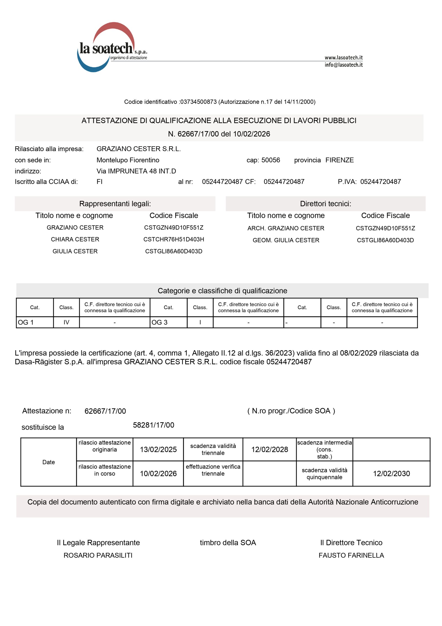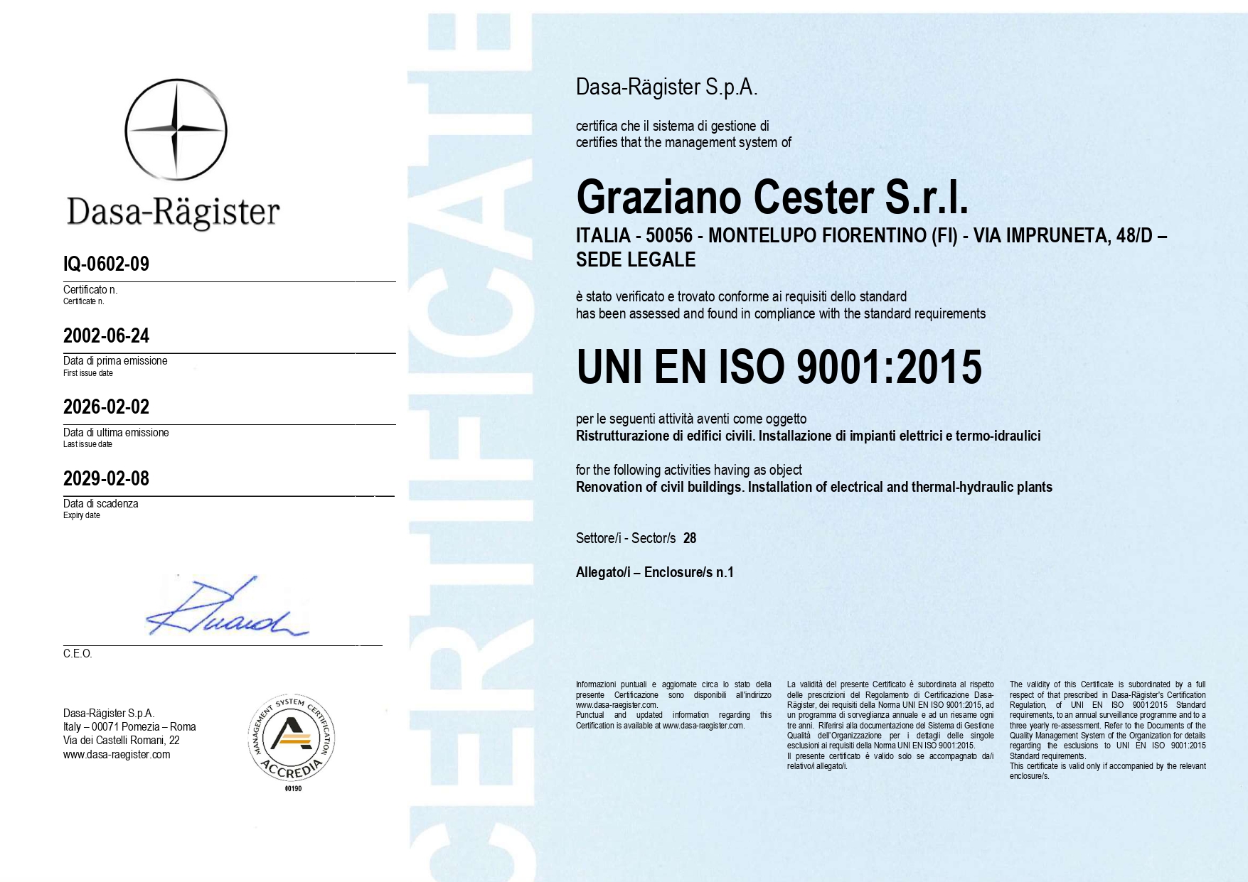 L’azienda opera, ed è certificata, da oltre 20 anni in conformità al sistema di Gestione ISO 9001:2015. E’ inoltre, in possesso di attestazione SOA dal 2001.